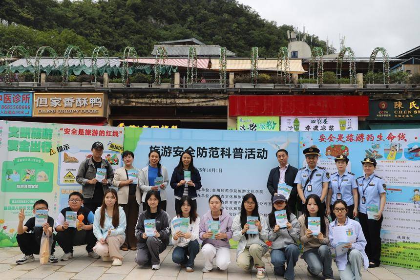 来自贵州师范学院的师生志愿者在各单位工作人员的协同下,积极为游客答疑解惑,将专业的旅游安全知识转化为通俗易懂的实用信息。许多游客纷纷表示,此次活动内容丰富、管用,有效增强了自身出游的风险防范能力和文明旅游意识。